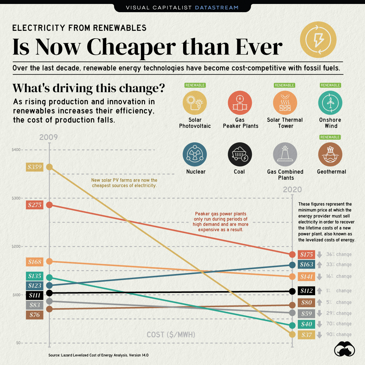Seems to be the beginning of the end for non-renewable energy. Not a moment too soon. Note the slopes of the lines, too. From Visual Capitalist.
