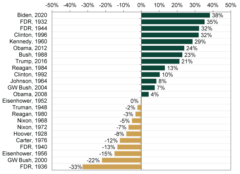 A surprising chart from Fisher Investments. Returns of the Standard and Poor’s 500 one year after a presidential election.