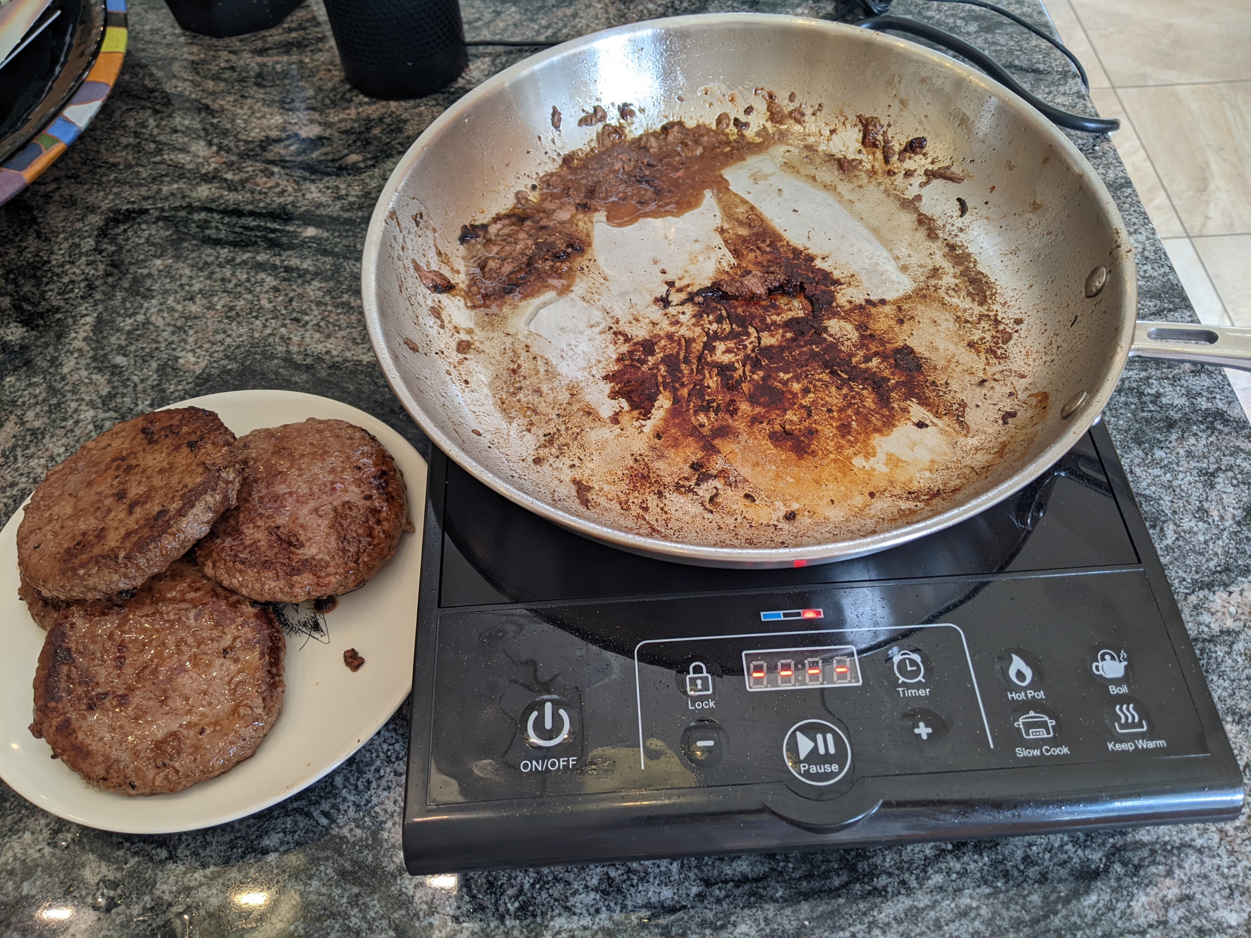 We have gas (propane actually) for heating and cooking. As part of my personal movement to Electrify Everything, I bought one of these little countertop induction hot plates. Have heard good things about them. Decided to get an inexpensive one, in case it didn’t work out. Bought this Austrian (Made in China) unit from Mueller for $50. Realized all of my cookware is anodized aluminum and none of it would work with an induction cooker. So I bought this frying pan from Misen for $60, a bit more than the cooktop itself. Was going to go slow, boil some water and maybe fry some eggs in a day or two. But we had burgers for dinner and decided to dive right in. Have to say it was better than I expected. Way better. Cleanup was a breeze too.