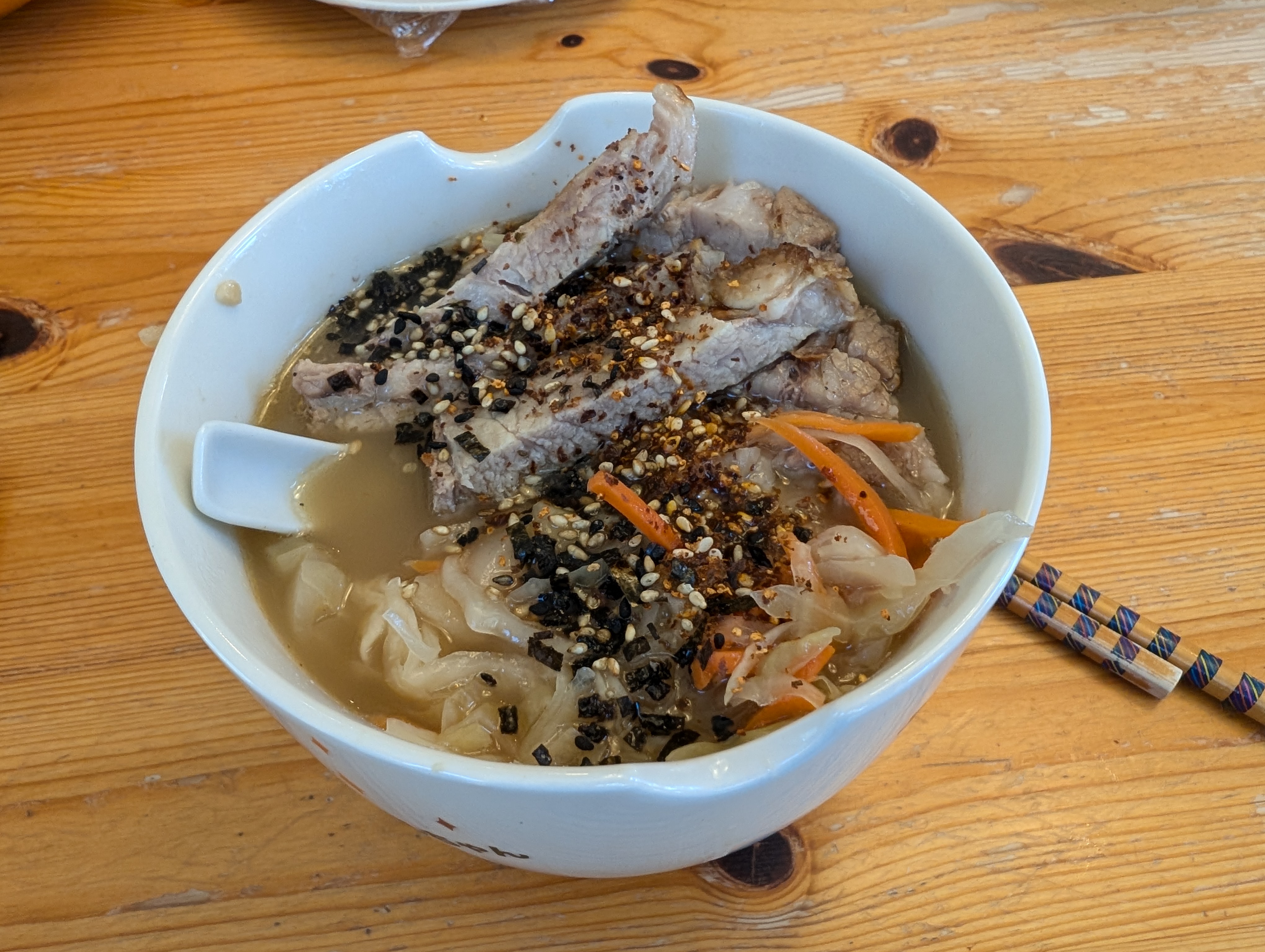 It’s been too hot for ramen, but it’s finally cooling off a little. Had some leftover pork roast, some noodles and chopped veggies. Not bad!