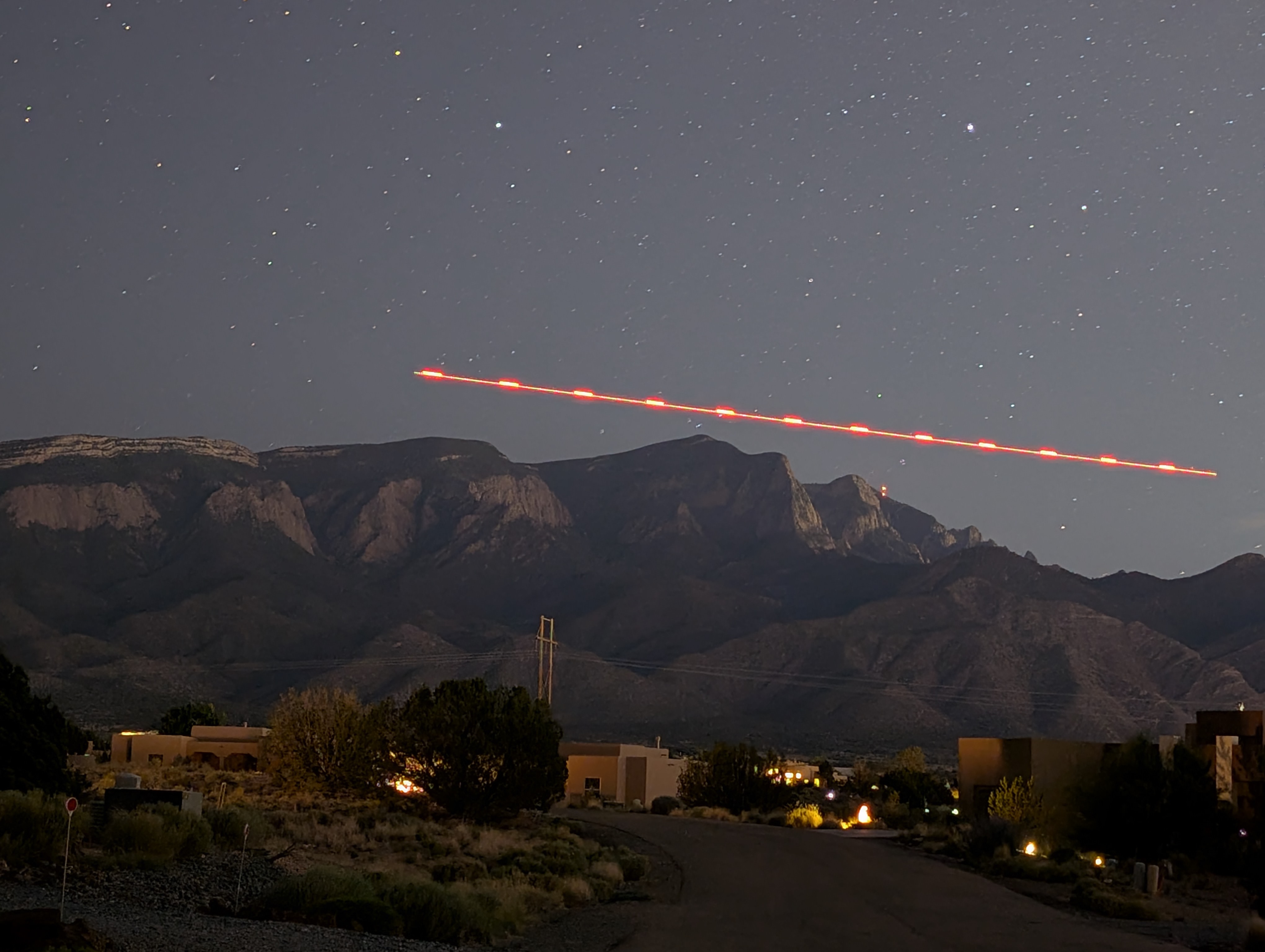 The first photos of the Sandias was marred by a helicopter flying right through the middle of the shot. It was a 5 minute exposure, so I was annoyed. Pointed the camera up to try and get the Big Dipper. Guess what? The same helicopter goes through the middle of the shot. Another 5 minute exposure. Ok, maybe kinda neat. I can see how this Astronomy mode works. But what are the odds of that?